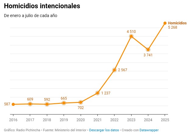 Pero no es todo. Los 5.268 homicidios intencionales son mayores en un 40,82%, respecto a los 3.741 asesinatos cometidos en el mismo periodo de 2024. Además, la cifra de este año es la más alta registrada en la historia del país.