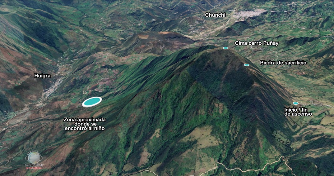 Referenciación sobre imagen de Google Earth. Zona aproximada en el cerro Puñay donde fue encontrado el niño Lucas Campaña.