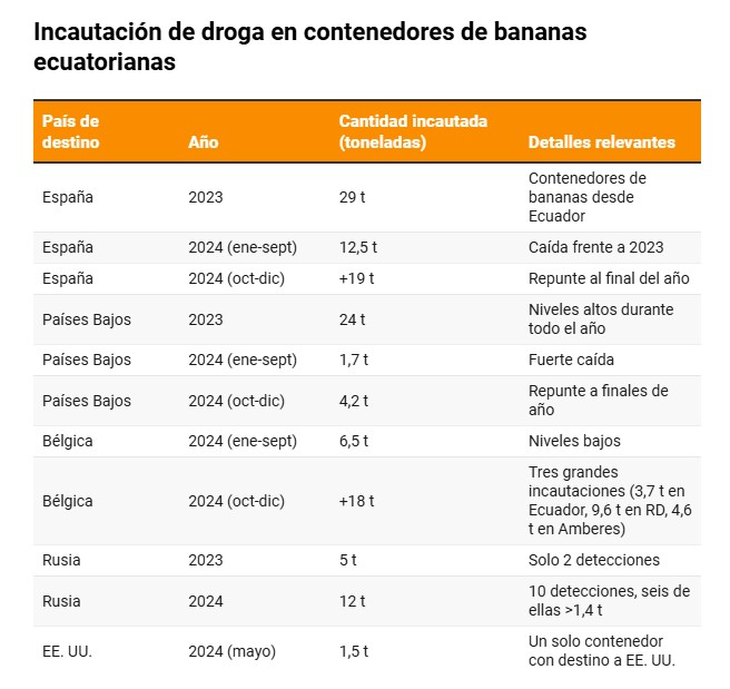 Rusia, por su parte, emergió como un nuevo destino clave. Si en 2023 se incautaron 5 toneladas en contenedores de bananas ecuatorianas, en 2024 la cifra saltó a 12 toneladas. Con el 16,8% de las exportaciones bananeras ecuatorianas, Rusia es hoy el principal comprador de la fruta.
